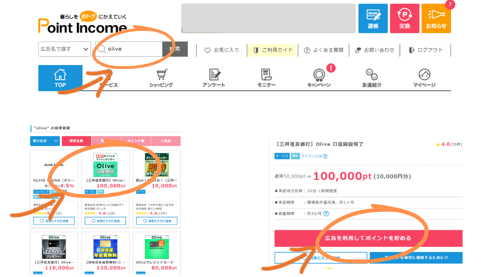 1.ポイントインカムのトップページから検索してoliveの広告をクリックします。するとOlive開設のページに飛びます